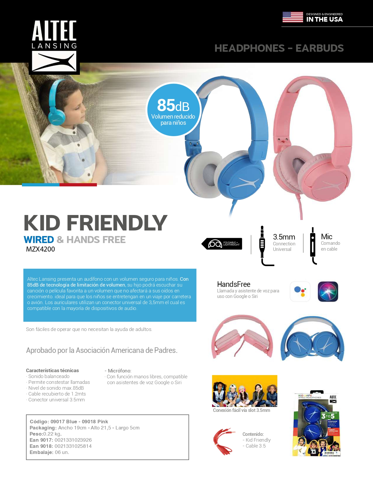Altec Lansing presenta un audífono con un volumen seguro para niños. Con 85dB de tecnología de limitación de volumen, su hijo podrá escuchar su canción o película favorita a un volumen que no afectará a sus oídos en crecimiento. ideal para que los niños se entretengan en un viaje por carretera o avión. Los auriculares utilizan un conector universal de 3,5mm el cual es compatible con la mayoría de dispositivos de audio.