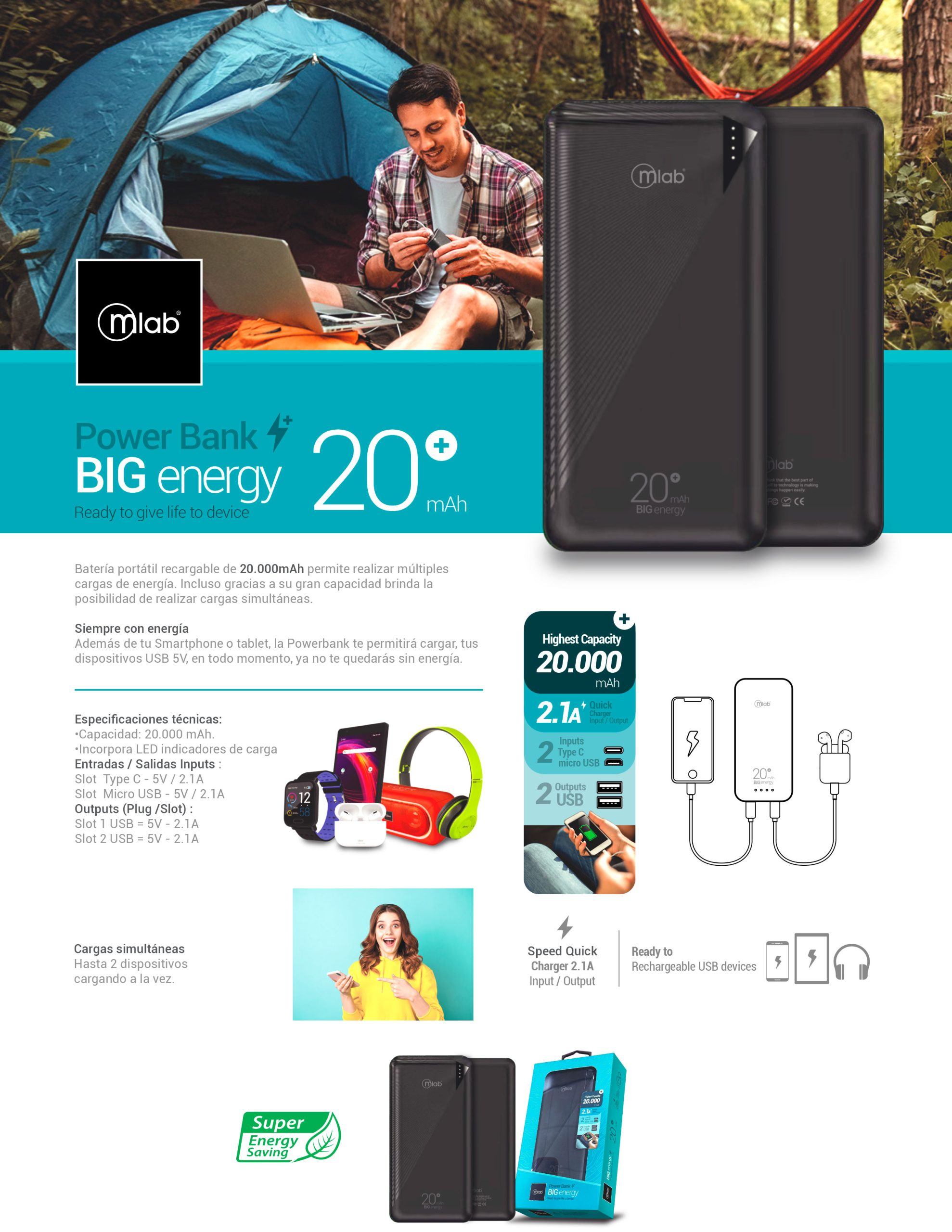 Batería portátil, Powerbank BIG energy 20.000 mAh