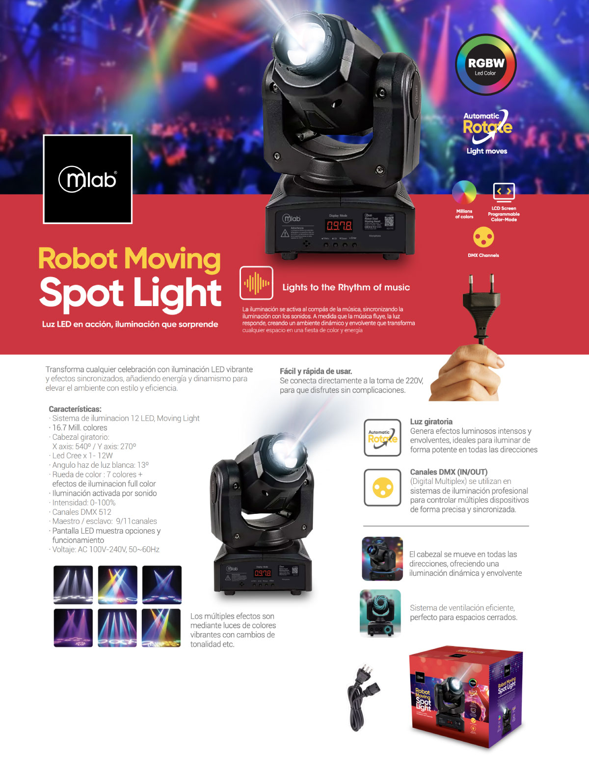 Características:· Sistema de iluminacion 12 LED, Moving Light