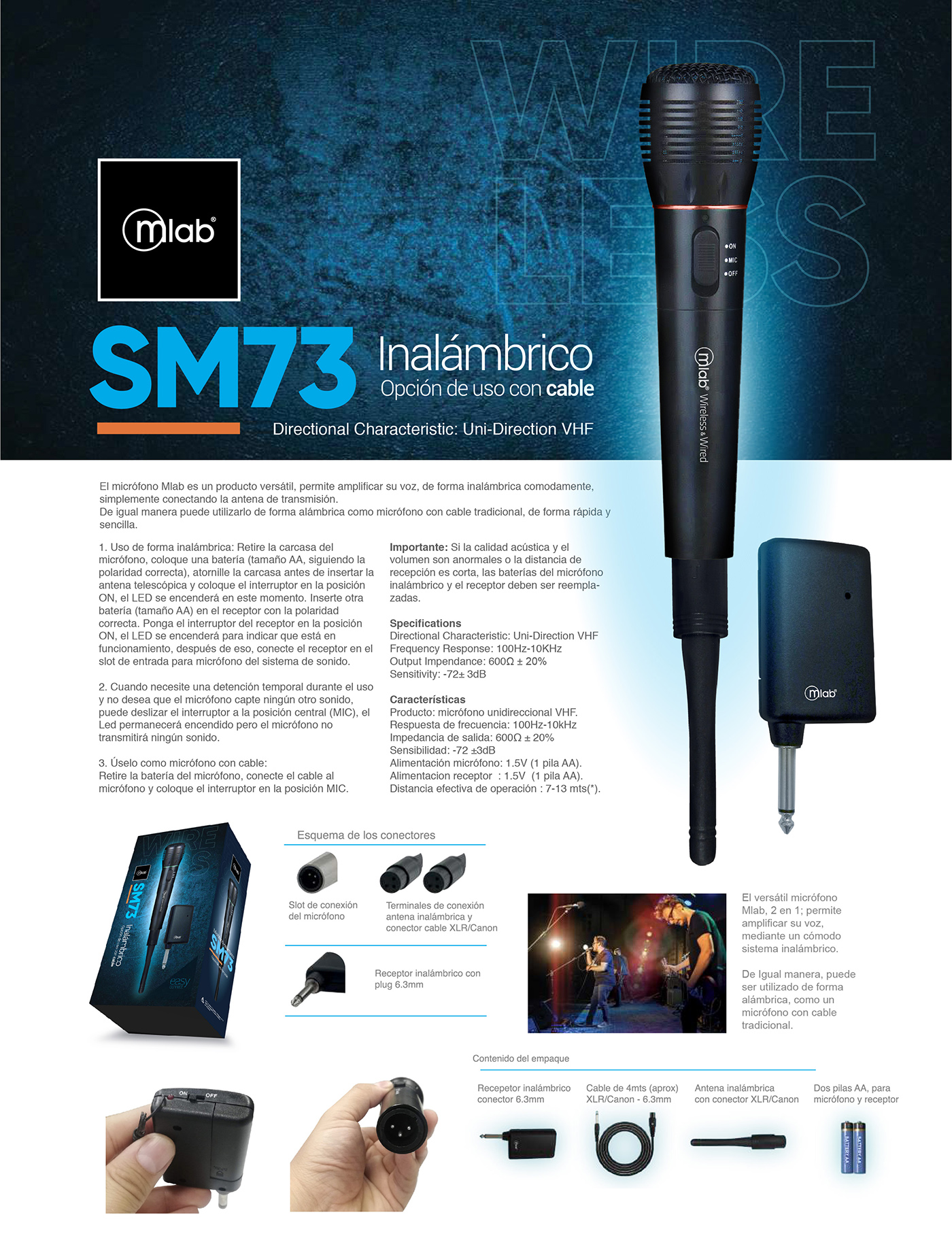 EL micrófono MLAB SM73 es un producto versátil; permite amplificar su voz mediante un cómodo sistema inalámbrico. De igual manera, puede utilizarlo de forma alámbrica como un micrófono con cable tradicional, de forma rápida y sencilla.