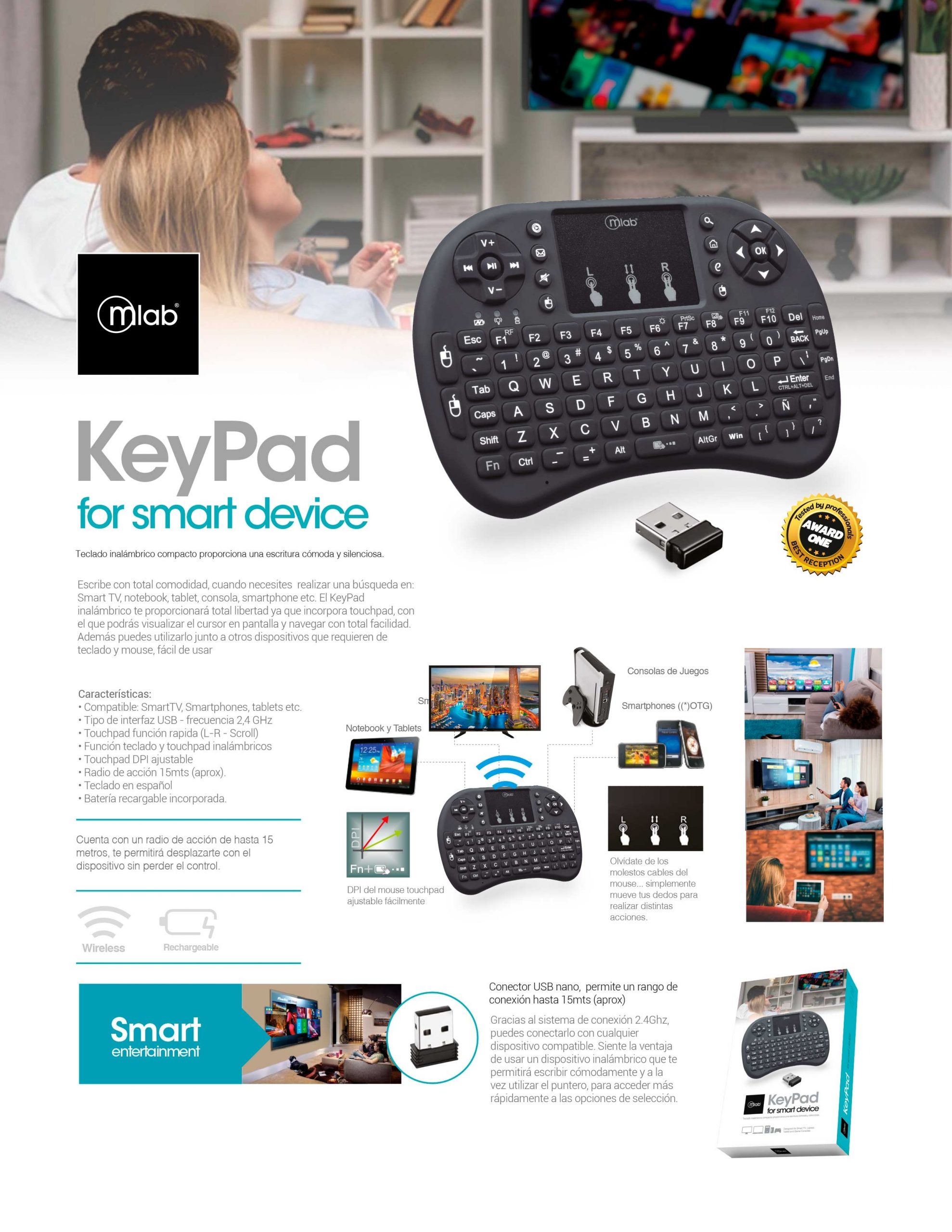 Escribe con total comodidad, cuando necesites realizar una búsqueda en: Smart TV, notebook, tablet, consola, smartphone etc. El KeyPad inalámbrico te proporcionará total libertad ya que incorpora touchpad, con el que podrás visualizar el cursor en pantalla y navegar con total facilidad. Además puedes utilizarlo junto a otros dispositivos que requieren de teclado y mouse, fácil de usar.